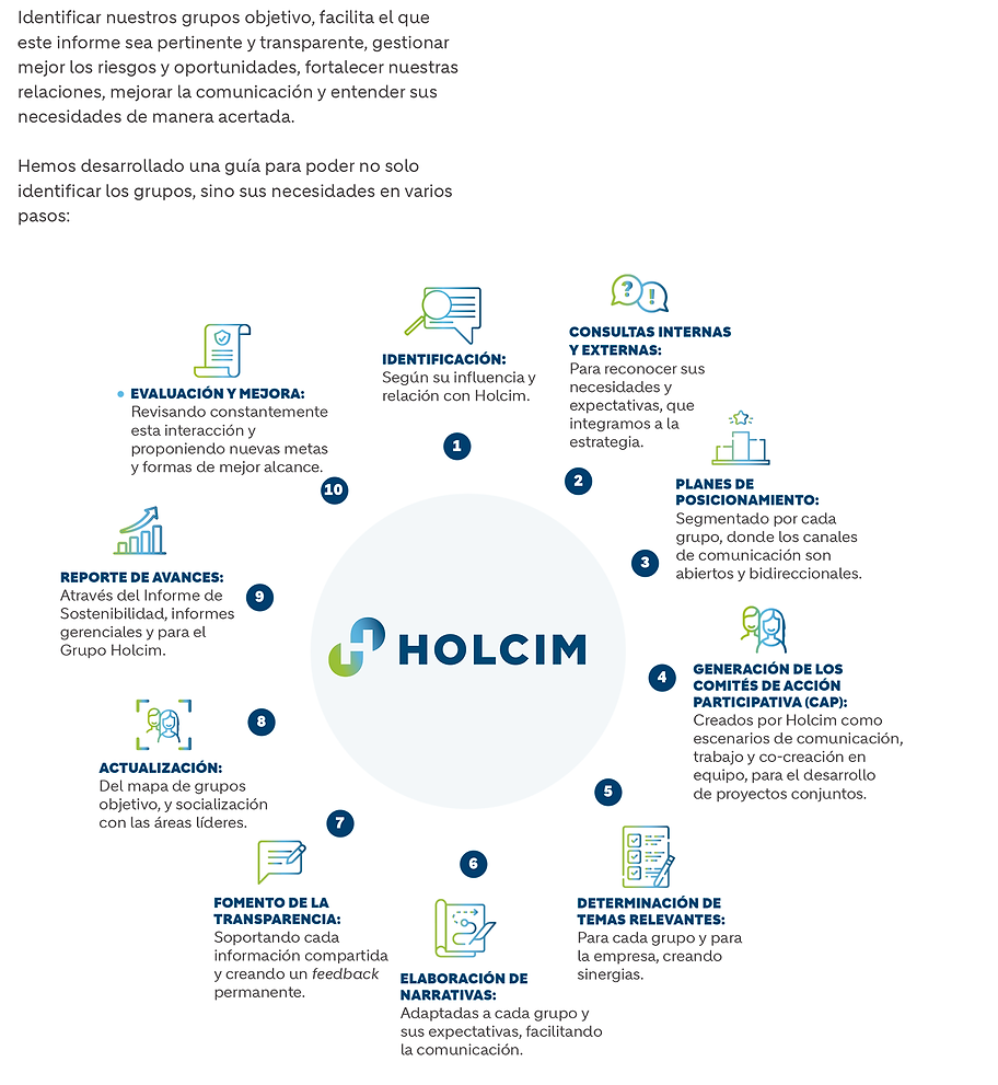 Este proceso nos permitió identificar datos esenciales para identificar oportunidades y riesgos de los impactos de Holcim; conocer las preocupaciones y expectativas de nuestros grupos de interés, fortaleciendo esos marcos de diálogo y trabajo para crear valor compartido; entender esos aspectos críticos para nuestra estrategia de sostenibilidad; identificar riesgos y oportunidades de nuevos negocios y entender y potenciar esos diferenciales positivos, para seguir posicionándonos en el mercado colombiano como un socio de progreso.